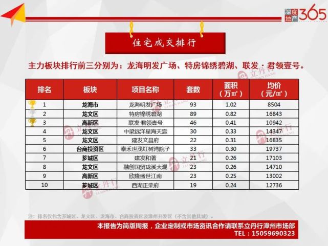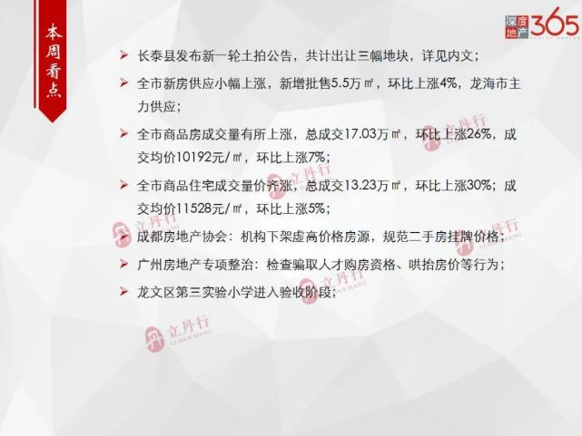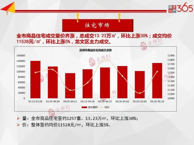2、本周漳州全市商品住宅成交量价齐涨,总成交13.23万㎡,环比上涨30%,成交均价11528元/㎡,环比上涨5%。
