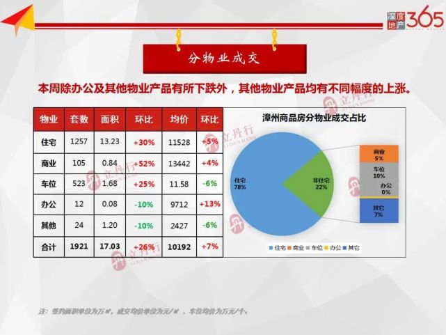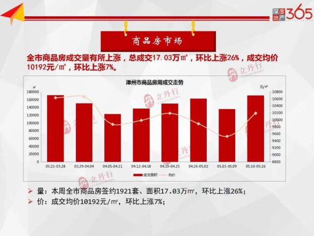 1、本周漳州全市商品房成交量有所上涨,总成交17.03万㎡,环比上涨26%,成交均价10192元/㎡,环比上涨7%;