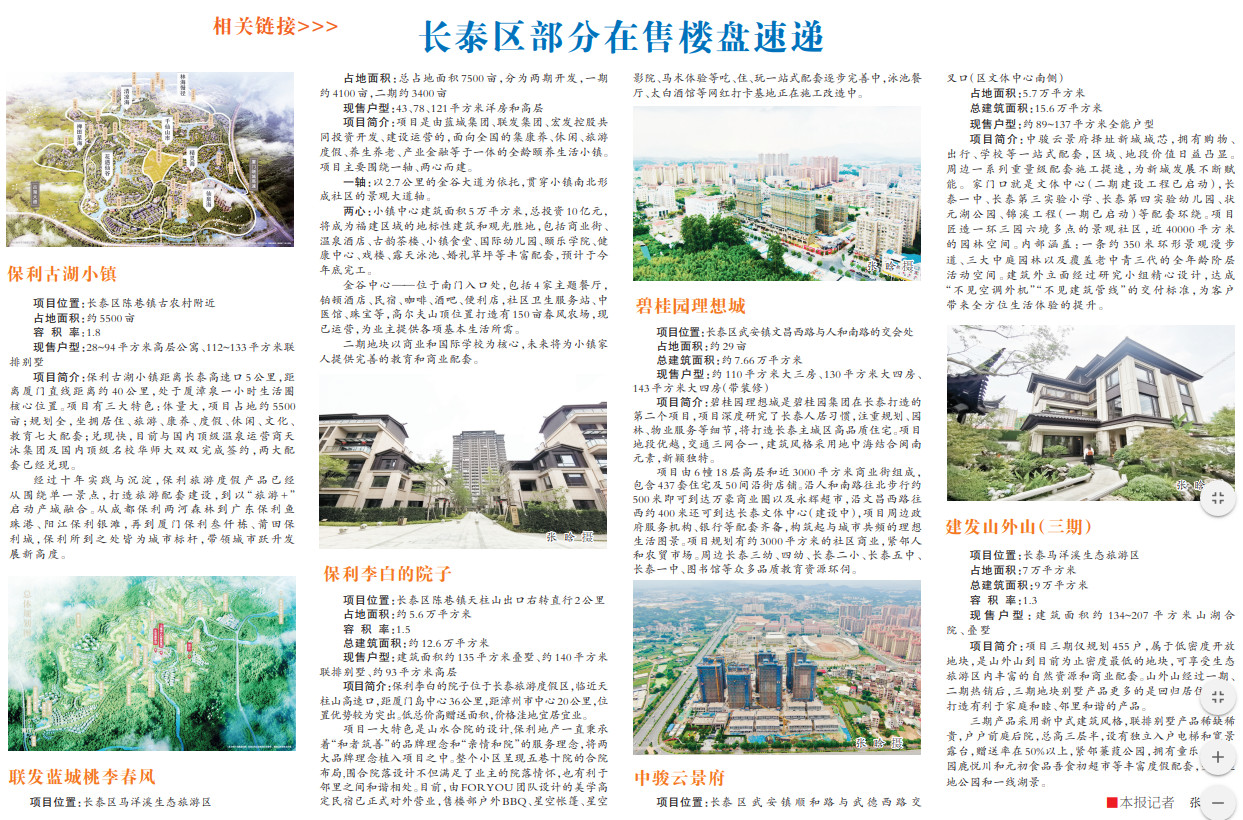 除了马洋溪区域,长泰还有不少依托优质资源而生的楼盘,如保利古湖小镇、保利李白的院子、半月山新月温泉公馆等,同样吸引了不少关注的目光。