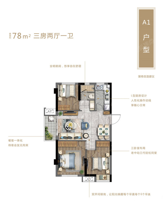 全明朗阔,悠享自在舒居 装修改造建议:餐客一体化,待客会友无拘束 三卧室布局中幼三代轻松同堂。双开间朝南,让阳光唤醒每个早晨。