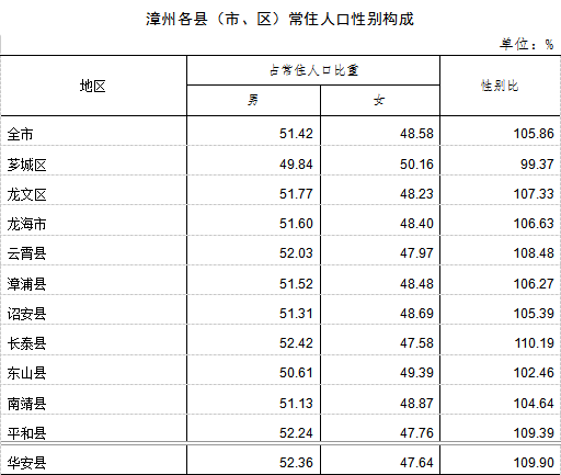 11个县(市、区)中,常住人口性别比在100以下的县(市、区)有1个,即芗城区;在100至110之间的县(市、区)有9个,即东山县、南靖县、诏安县、漳浦县、龙海市、龙文区、云霄县、平和县和华安县;在110以上的县(市、区)有1个,即长泰县。