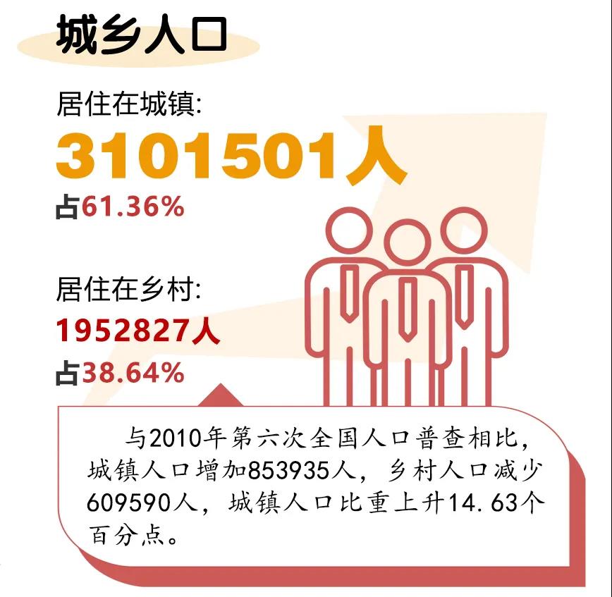 全市常住人口中,居住在城镇的人口为3101501人,占61.36%;居住在乡村的人口为1952827人,占38.64%。与2010年第六次全国人口普查相比,城镇人口增加853935人,乡村人口减少609590人,城镇人口比重上升14.63个百分点。