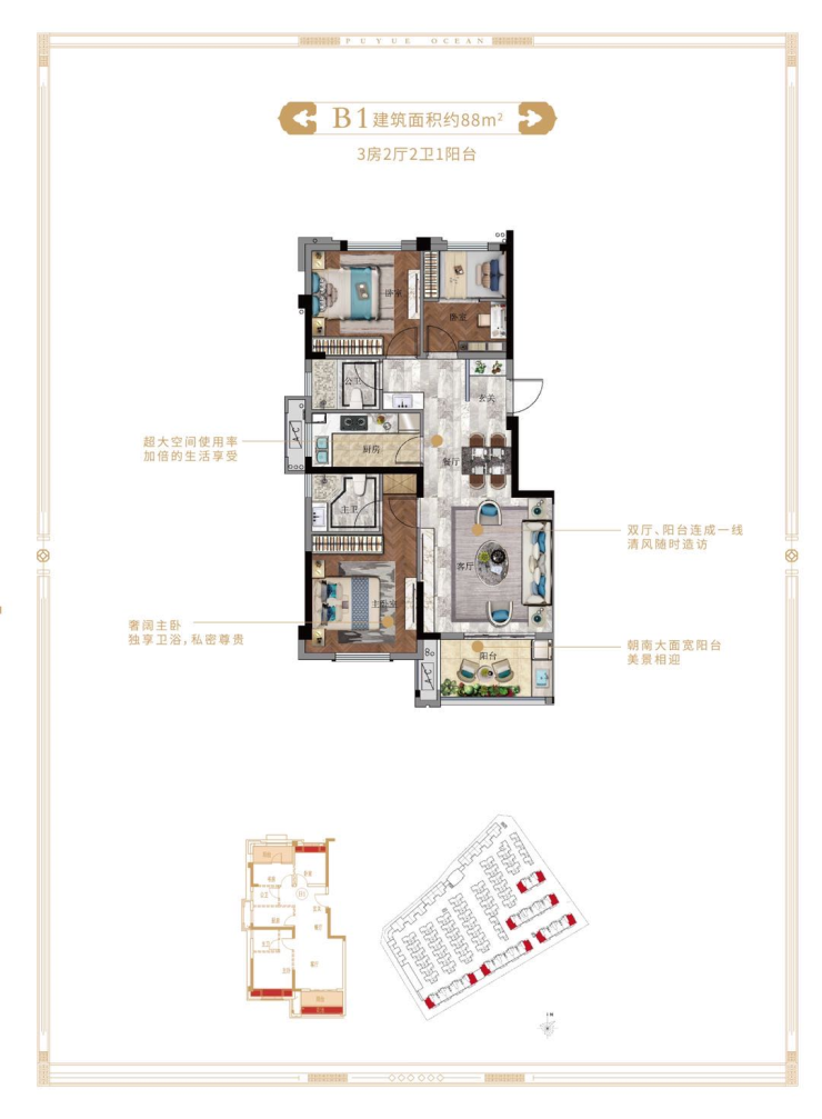 超大空间使用率,加倍的生活享受。双厅、阳台连成一线清风随时造访。奢阔主卧,独享卫浴,私密尊贵。朝南大面宽阳台该,美景相迎。