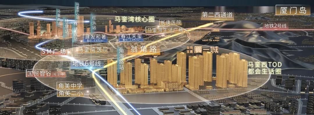 金地宝嘉·厦一城,坐落角美——厦漳同城化前沿阵地马銮西新城。直线距离约50米6号线真地铁口(在建),北临入厦主干道翁角路(在建),连通海沧隧道,可实现直线入岛;连通厦漳同城大道多维交通网,同时畅享千亿马銮湾优质配套。