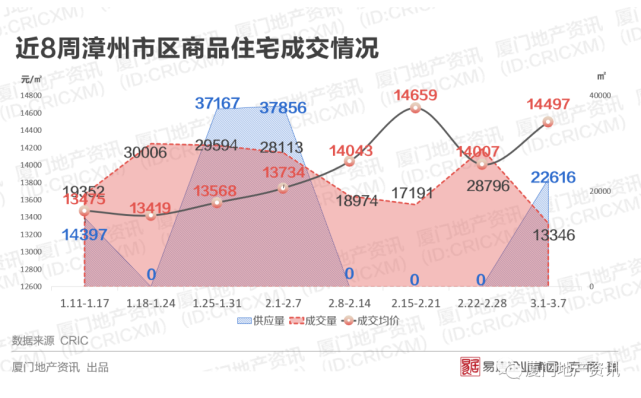 经过2月底集中备案潮后,本周漳州市区住宅市场成交高位回落,成交面积仅1.33万㎡,环比下滑53.7%,成交均价因低价项目占比回落而结构性回升至14497元/㎡,环比上涨3.5%,整体呈现量跌价升态势。