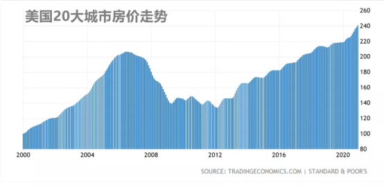 根据凯恩席勒指数,2020年12月,美国20大城市房价同比上涨10.1%,创下2014年以来的最大升幅。自此,美国房价已经超越2007年次贷危机之前的水平,相比2009年的低谷,接近翻倍。