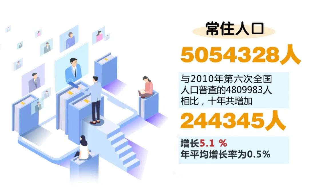 全市常住人口为5054328人,与2010年第六次全国人口普查的4809983人相比,十年共增加244345人,增长5.1 %,年平均增长率为0.5%。
