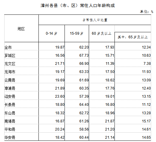 11个县(市、区)中,15-59岁人口比重在60%以上的县(市、区)有9个,即芗城区、龙文区、长泰县、龙海市、东山县、云霄县、南靖县、华安县和漳浦县;在50%-60%之间的县(市、区)有2个,即平和县、诏安县。所有县(市、区)65岁及以上老年人口比重超过7%,其中,3个县(区)65岁及以上老年人口比重超过14%,即南靖县、华安县、平和县。