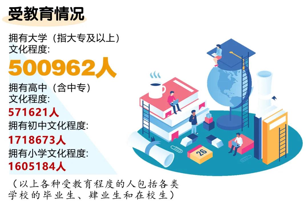 全市常住人口中,拥有大学(指大专及以上)文化程度的人口为500962人;拥有高中(含中专)文化程度的人口为571621人;拥有初中文化程度的人口为1718673人;拥有小学文化程度的人口为1605184人(以上各种受教育程度的人包括各类学校的毕业生、肄业生和在校生)。与2010年第六次全国人口普查相比,每10万人中拥有大学文化程度的由5933人上升为9912人;拥有高中文化程度的由10840人上升为11310人;拥有初中文化程度的由38177人下降为34004人;拥有小学文化程度的由34456人下降为31759人。