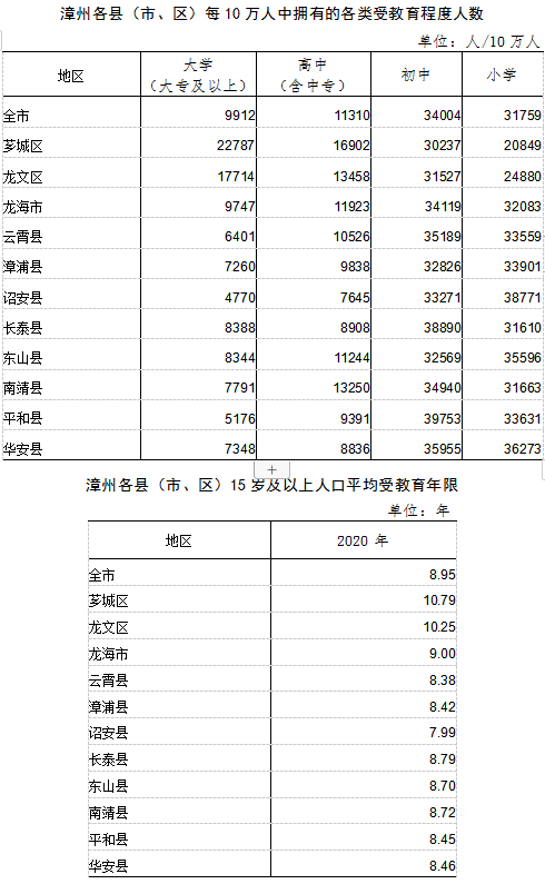 11个县(市、区)中,15岁及以上人口的平均受教育年限在10年以上的县(市、区)有2个,即芗城区、龙文区;在8年至10年之间的县(市、区)有8个,即龙海市、长泰县、南靖县、东山县、华安县、平和县、漳浦县和云霄县;在8年以下的县(市、区)有1个,即诏安县。