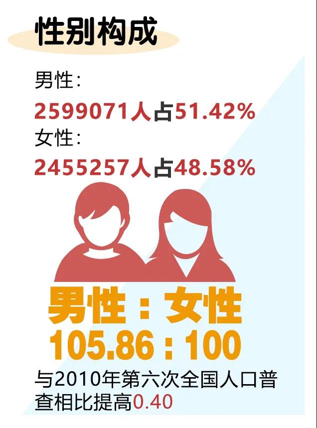全市常住人口中,男性人口为2599071人,占51.42%;女性人口为2455257人,占48.58%。常住人口性别比(以女性为100,男性对女性的比例)为105.86,与2010年第六次全国人口普查相比提高0.40。