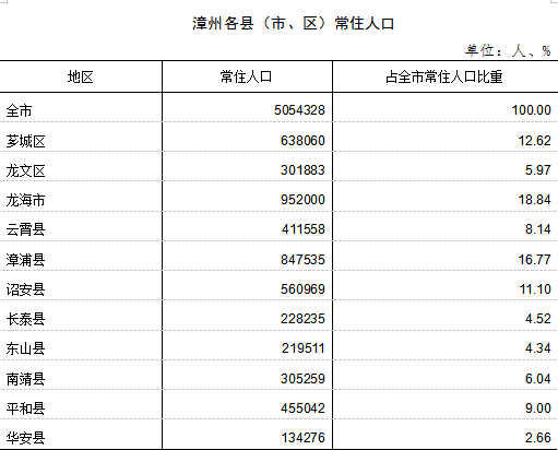 11个县(市、区)中,常住人口性别比在100以下的县(市、区)有1个,即芗城区;在100至110之间的县(市、区)有9个,即东山县、南靖县、诏安县、漳浦县、龙海市、龙文区、云霄县、平和县和华安县;在110以上的县(市、区)有1个,即长泰县。