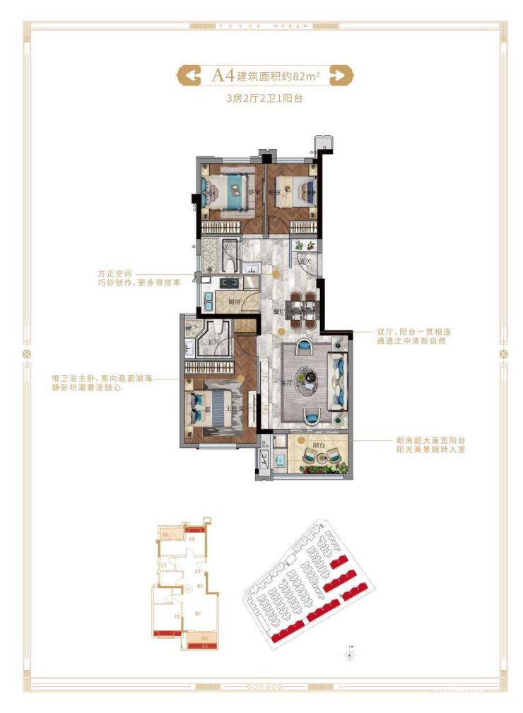 方正空间,巧妙创作,更多得房率。双厅、阳台一贯相连,通透之中清新自然。带卫浴主卧,南向直面湖海,静卧听潮奢适随心。朝南超大面宽阳台,阳光美景婉转入室。