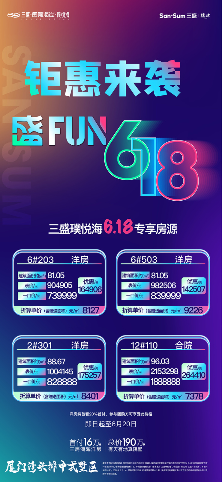 #钜惠来袭 盛Fun618# 三盛璞悦海618限时钜惠,好房抢购正当时,首付16万起,墅居厦门海!!即日起至6月20日,4套618专享房源,首付16万起三房湖海洋房,总价190万起有天有地真院墅!!