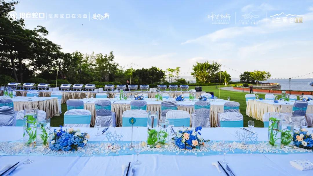 活动现场鲜花着锦,流光溢彩,傍晚的海风温柔而清爽,海浪和音乐交响和鸣,迎来了款款而至的参会嘉宾们。